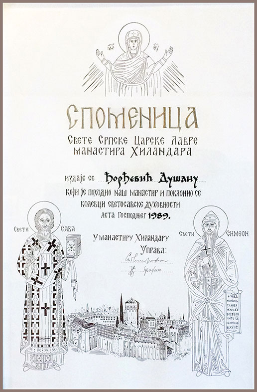“Много сте ме обрадовали вешћу да отварате прво Српско православно погребно предузеће у Чикагу. Та потреба се одавно осећала међу нашим верницима у Америци. Благо њима сада. Имаће неко ко ће да их достојно и по светосавским обичајима испраћа из земаљске у Небеску Србију. Па још какав назив: “Света Гора”! Просто да човек и пре времена зажели да се што пре пресели у ово перче неба на земљи и најсветији кутак српски, кога сте избрали за симбол Ваше фирме.”